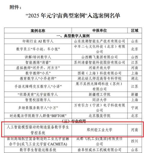 近日,工业和信息化部科技司正式公布了“2025年元宇宙典型案例”入选案例名单,我校推荐的“人工智能模型驱动的制造装备数字孪生管控系统”案例成功入选。